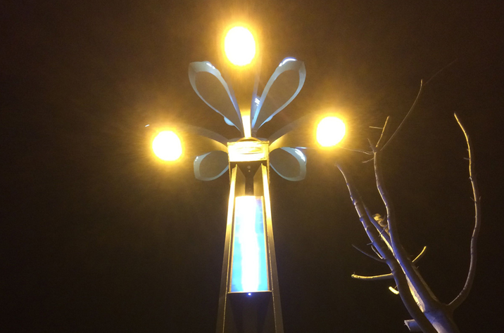 2016年年初,為配合延安新區全城改造項目,華體照明公司設計并安裝了八叉九火鳳凰玉蘭燈。該燈以傳統華燈為基礎,將功能照明和景觀效果完美結合,燈桿顛覆傳統單桿,由四根矩桿組成,寓意“四平八穩、四足鼎立”。燈桿中部裝有玻璃燈箱,七彩變色,使得鳳凰玉蘭在夜間顯得更加光彩奪目。